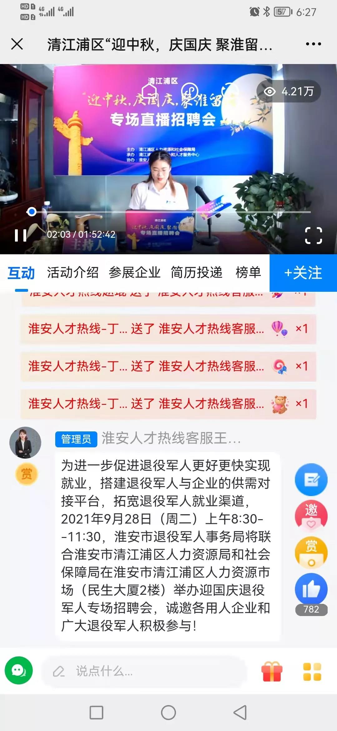 萬家團(tuán)圓迎中秋,四海歡騰慶國慶。為慶祝偉大祖國72周年華誕,弘揚中華傳統(tǒng)佳節(jié)文化,同時打造服務(wù)大局、服務(wù)淮安就業(yè)的品牌工程,吸引廣大人才就業(yè)者的青睞,切實為我市廣大求職人才及企業(yè)搭建優(yōu)質(zhì)交流平臺,拓寬就業(yè)渠道,為我市引進(jìn)人才助力轉(zhuǎn)型發(fā)展提供智力支持。2021年9月17日清江浦區(qū)人力資源和社會保障局成功開展“迎中秋,慶國慶 聚淮留浦”專場直播招聘活動,參展企業(yè)11家,提供5000+招聘崗位,吸引了4.2萬+求職者觀看。