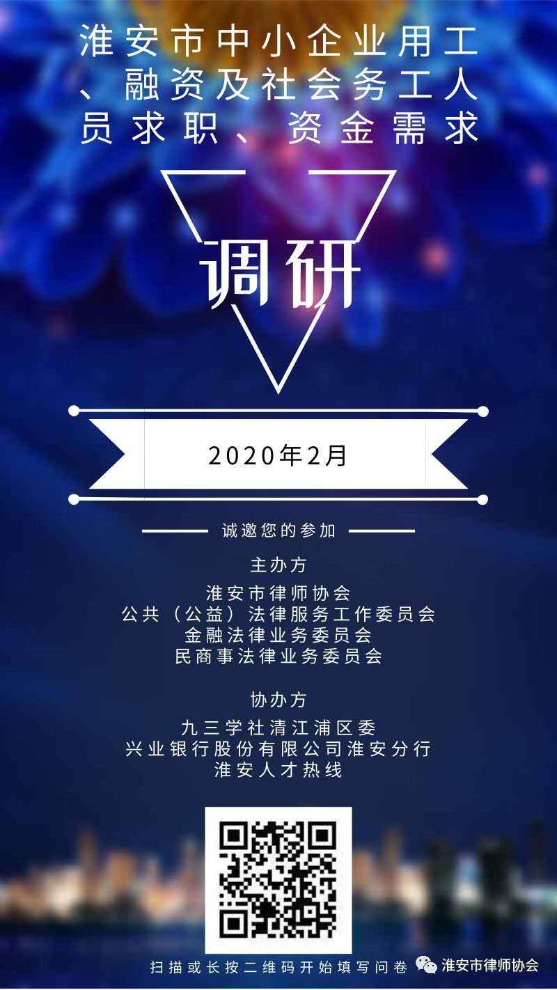 5、本調(diào)研問卷由淮安市律師協(xié)會理事會公共(公益)法律服務(wù)委員會、金融法律業(yè)務(wù)委員會、民商法律業(yè)務(wù)委員會發(fā)起,九三學(xué)社清江浦區(qū)委、興業(yè)銀行股份有限公司淮安分行、淮安贏夏人力資源有限公司(淮安人才熱線)予以技術(shù)支持共同制作。