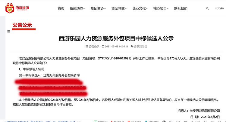 7月2日,從西游集團(tuán)官方網(wǎng)站了解到江蘇萬高服務(wù)外包有限公司以第一名的優(yōu)秀成績(jī)成功中標(biāo)淮安西游樂園有限公司人力資源服務(wù)外包項(xiàng)目(項(xiàng)目編號(hào):XYJT/XYLY-018/013021),淮安西游樂園有限公司在西游集團(tuán)官網(wǎng)公布了中標(biāo)候選人