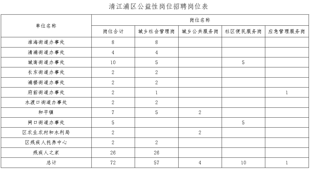 本次公開招聘公益性崗位72個,其中:城鄉(xiāng)社會管理崗57個、城鄉(xiāng)公共服務(wù)崗4個、社區(qū)便民服務(wù)崗10個、應(yīng)急管理服務(wù)崗1人。見《清江浦區(qū)公益性崗位招聘崗位表》(附件1)